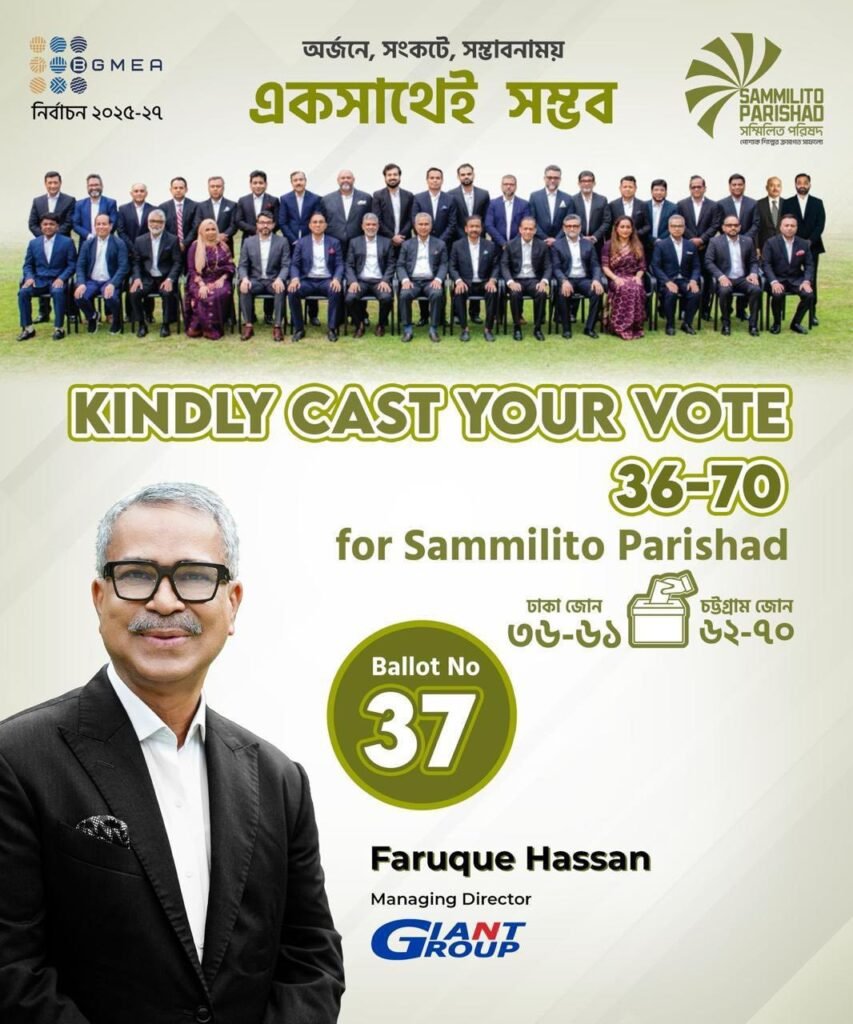 Currently serving as the Chief Election Coordinator for the Sammilito Parishad panel for the upcoming 2025–2027 BGMEA election, Faruque Hassan is leading a team of second-generation, proven and professional entrepreneurs. They are committed to navigating the apparel sector through new challenges like LDC graduation, global conflicts, trade tariffs, and economic slowdowns.