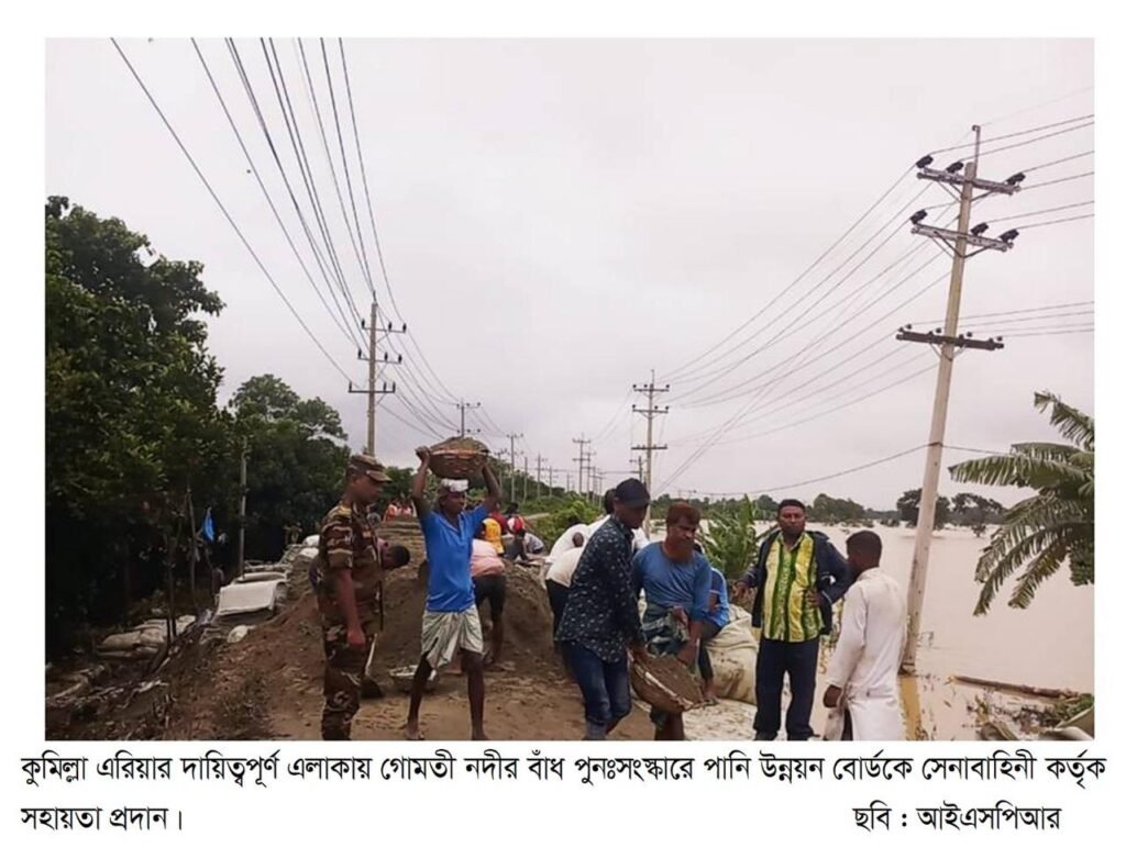 In the last 24 hours (31 August 2024), a total of 50 flood-affected persons were rescued by the armed forces, 56,387 packets of food items and 1,150 cooked meals were distributed among the flood victims. Apart from this, a total of 8,686 people have been provided medical assistance today through temporary medical teams consisting of expert doctors of the armed forces. Meanwhile, the armed forces conducted rescue and relief distribution activities in the flood-affected areas through 14 helicopter sorties. It should be noted that the Bangladesh Army has continued to provide assistance to the Water Development Board in the reconstruction of the Gomti river dam in the responsible area of Comilla area. Bangladesh Navy today conducted relief distribution and medical service support activities among flood affected people of Feni and Bhola.