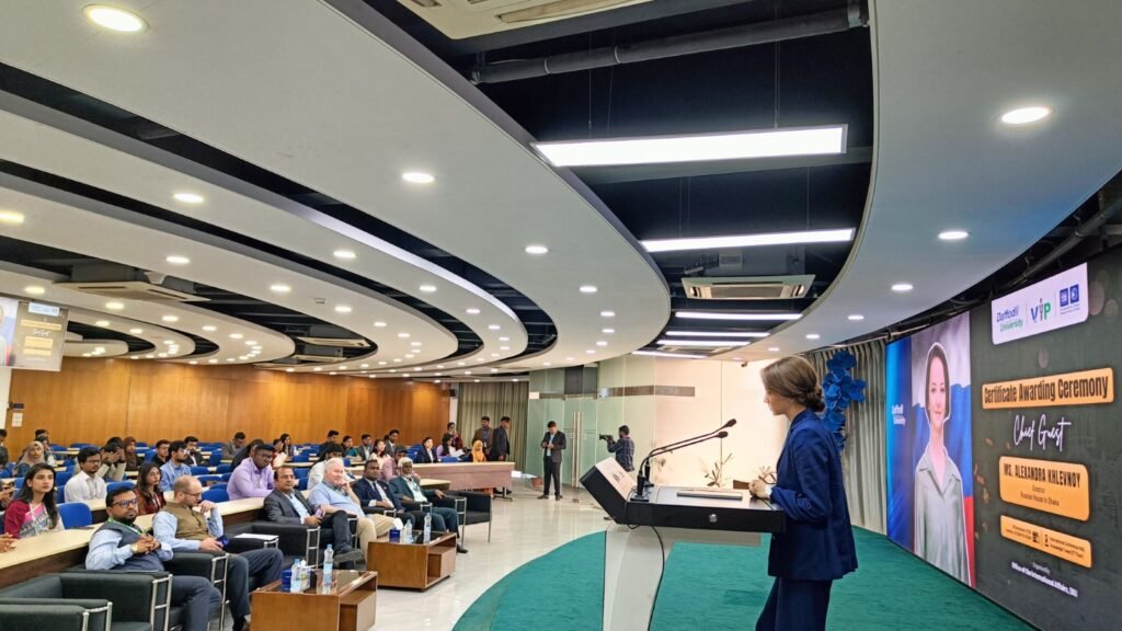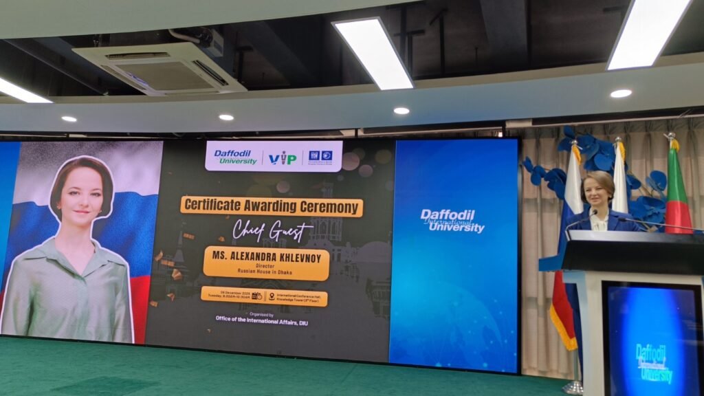 The certificate distribution ceremony of Russian Language Short Course was successfully held at Daffodil International University (DIU). The course was conducted from 6 October to 25 November 2025 under the supervision of a professor from St. Petersburg State University. A total of 48 participants completed the course and obtained certificates.
