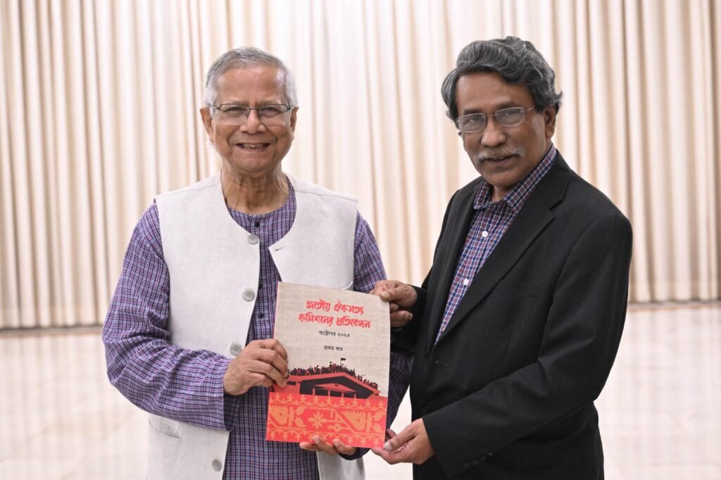 Present today during the handover of the report were Consensus Commission Vice-Chairman Professor Ali Riaz, Commission members Justice Md. Emdadul Haque, Dr. Iftekharuzzaman, Dr. Badiul Alam Majumder, Dr. Md. Ayub Mia and Special Assistant to the Chief Advisor Monir Haider.