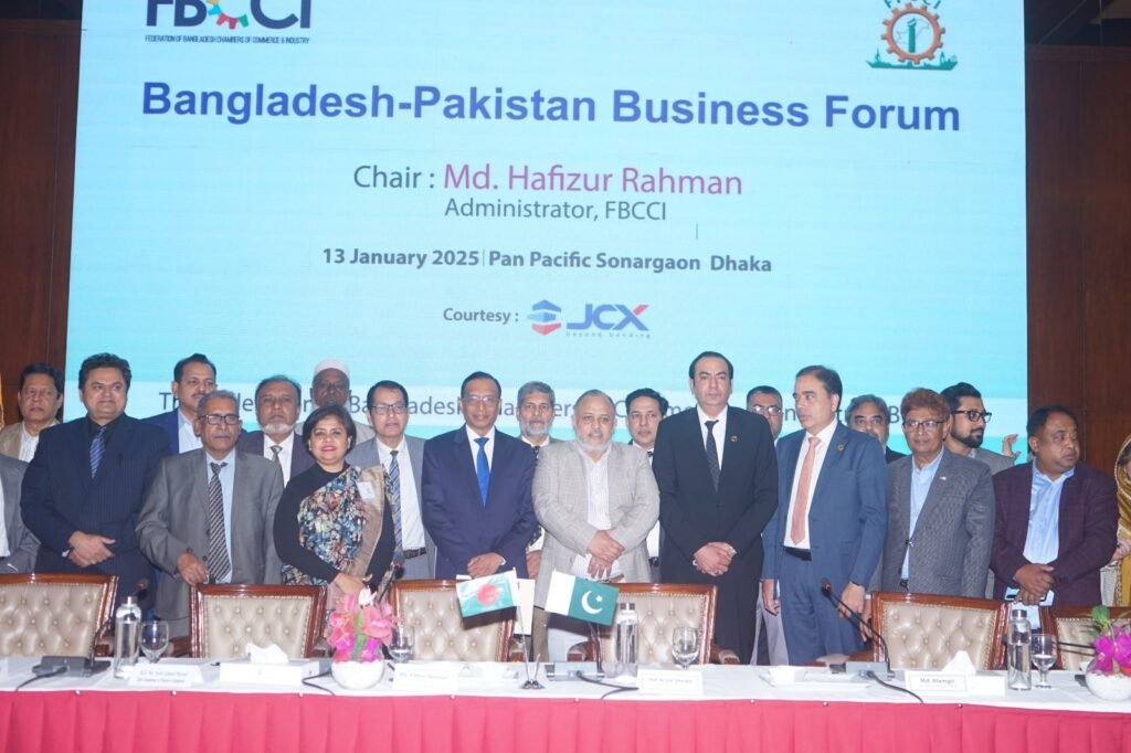 On Monday (January 13, 2025), at the ‘Bangladesh-Pakistan Business Forum’ organized by FBCCI with the business delegation of The Federation of Pakistan Chambers of Commerce and Industry (FPCCI) at Hotel Sonargaon in the capital, business leaders from both countries expressed their interest in taking joint initiatives in various promising sectors. The meeting was presided over by FBCCI Administrator Md. Hafizur Rahman.