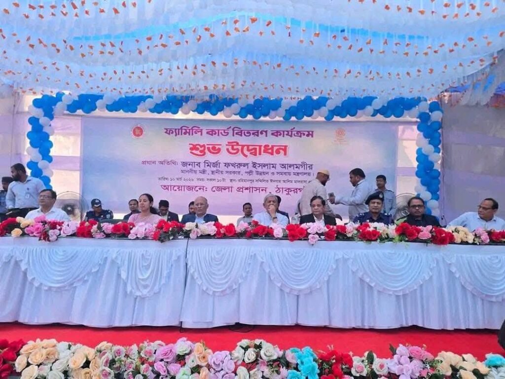 The family card distribution program has been inaugurated at the premises of the Sammilit UI Alim Madrasa of Rahimanpur Union in Thakurgaon Sadar Upazila. BNP Secretary General and Honorable Minister of the Ministry of Local Government, Rural Development and Cooperatives Mirza Fakhrul Islam Alamgir inaugurated the program as the chief guest.