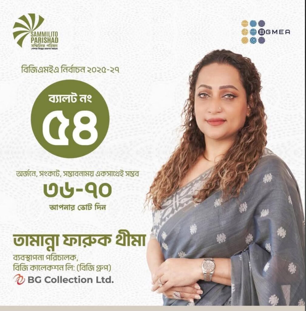 Tamanna Farroque Thema is currently an active member of the Bangladesh Garment Manufacturers and Exporters Association (BGMEA) and is contesting in the upcoming BGMEA elections as a candidate from the Sammilito Parishad panel (Ballot No. 54).